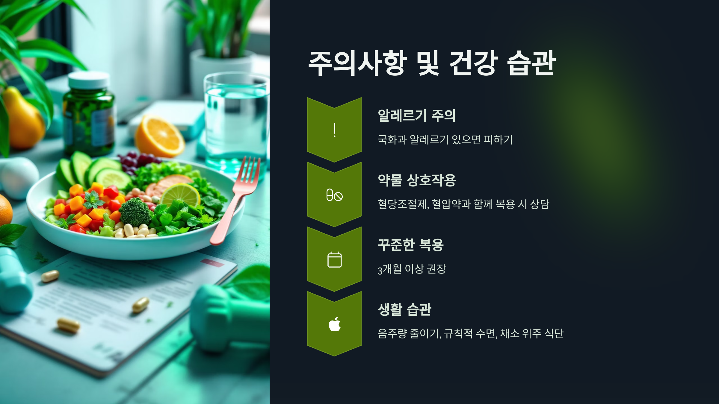 | 약물 상호작용 | 혈당조절제나 혈압약 등과 상호작용 가능성이 있으므로 병용 시 전문가 상담 필요 |