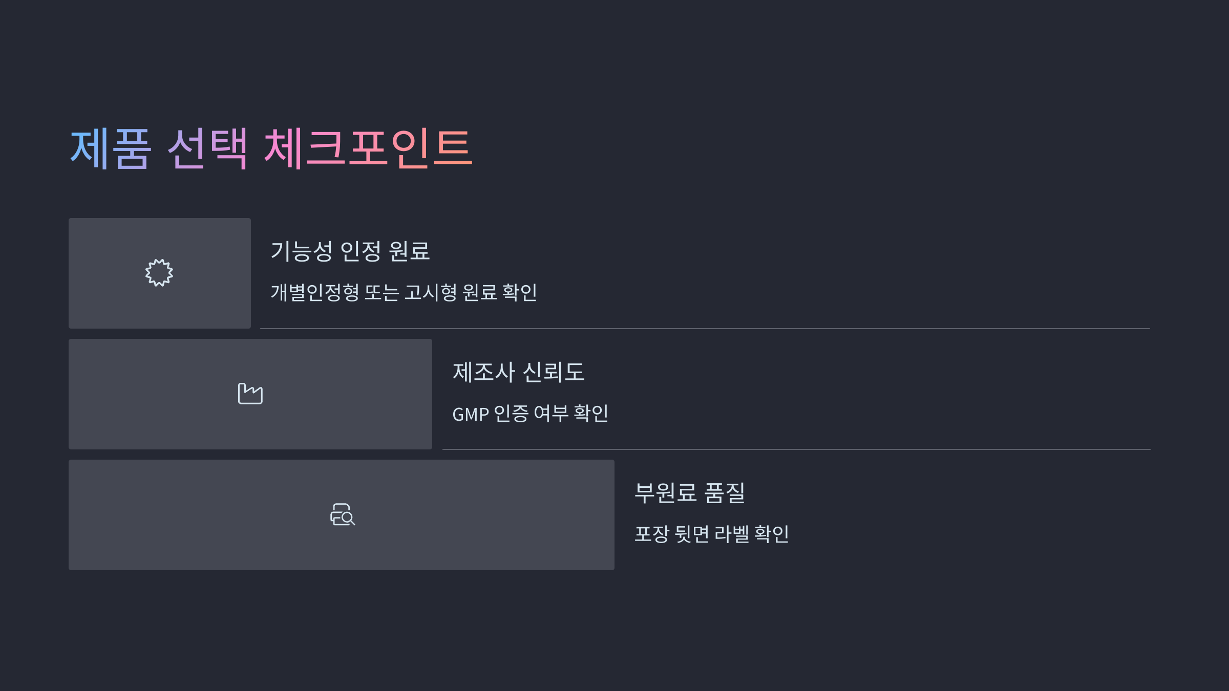기능성 원료의 과학적 근거, 개별인정 여부, 제조사 신뢰도 등을 종합적으로 따져야 합니다.