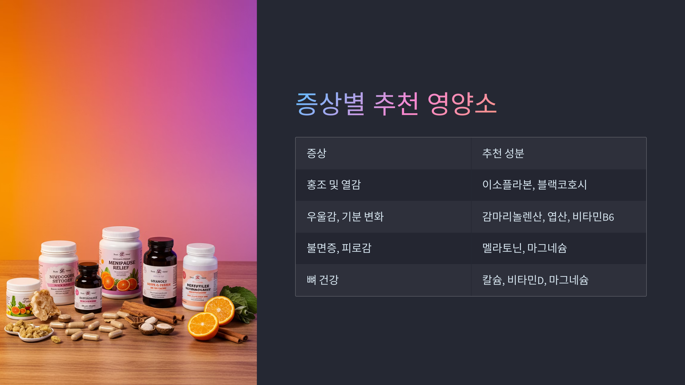 갱년기 증상은 다양한 만큼, 각각의 증상에 맞는 영양소를 골라 섭취하는 것이 중요합니다. 아래 표에서 증상별 추천 성분을 한눈에 확인해보세요.