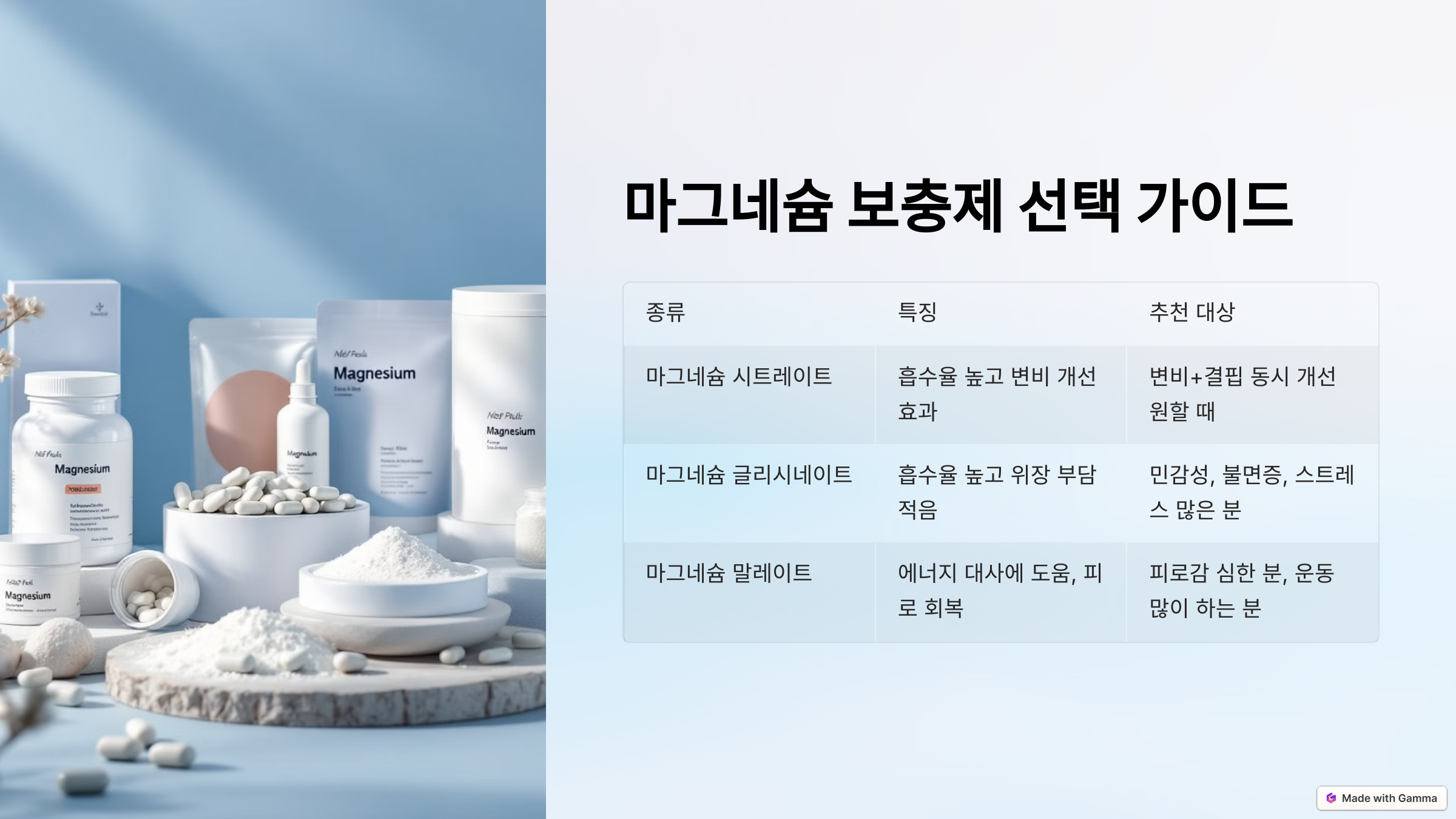 | 마그네슘 시트레이트 | 흡수율 높고 변비 개선 효과 있음 | 변비+결핍 동시 개선 원할 때 |