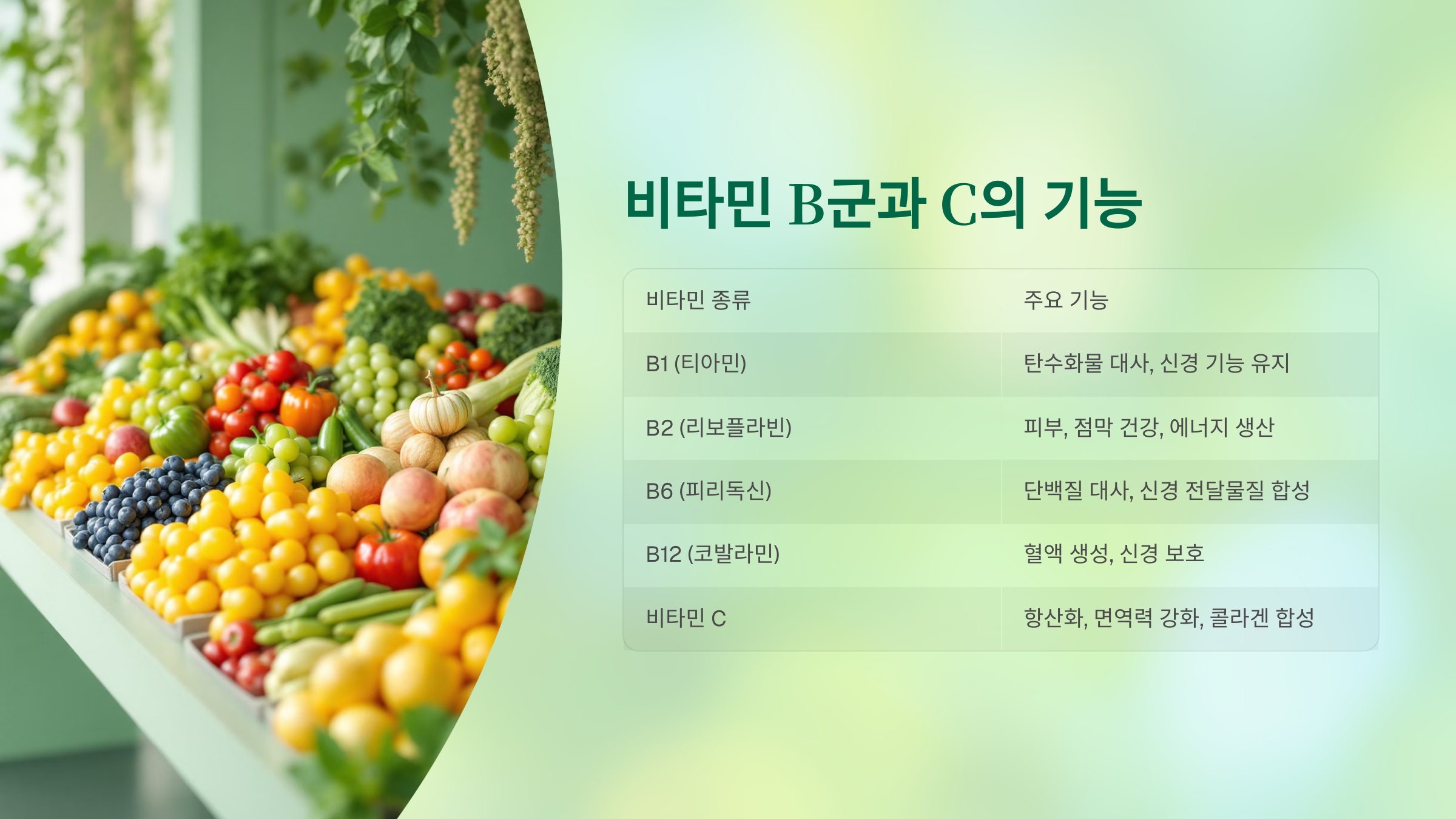 | B1 (티아민) | 탄수화물 대사, 신경 기능 유지 |