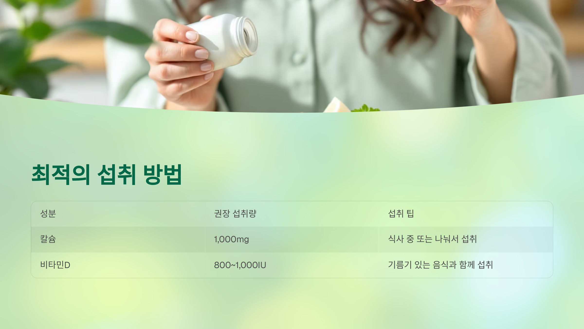 | 칼슘 | 1,000mg | 식사 중 또는 나눠서 섭취 |