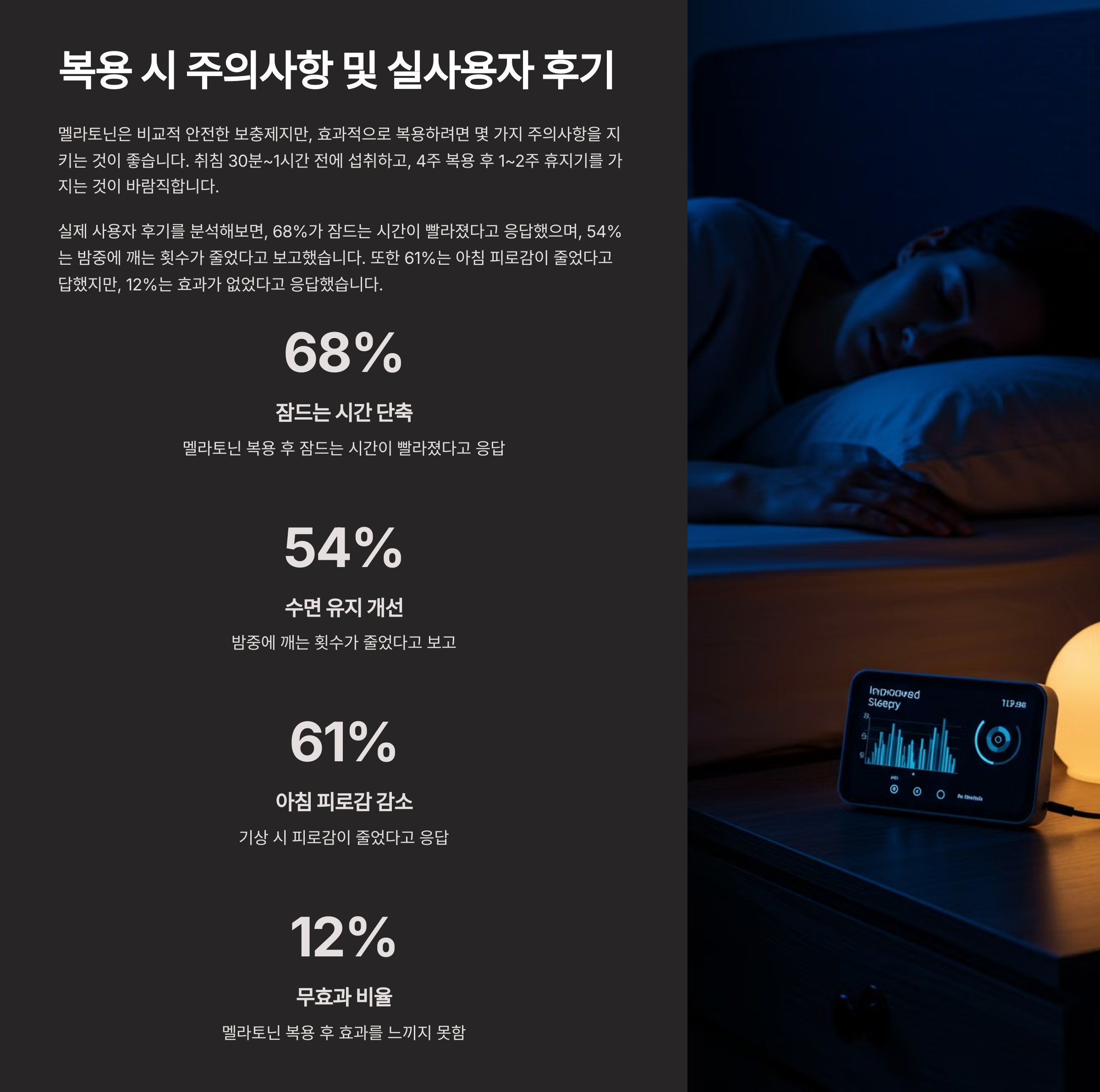 멜라토닌은 개인차가 크기 때문에 다양한 후기를 참고하는 것이 중요해요. 실제 사용 후기를 분석해 보면 효과를 본 사례가 많지만, 복용량이나 브랜드에 따라 차이가 있습니다. 아래는 100명 설문 기반 후기 요약입니다.