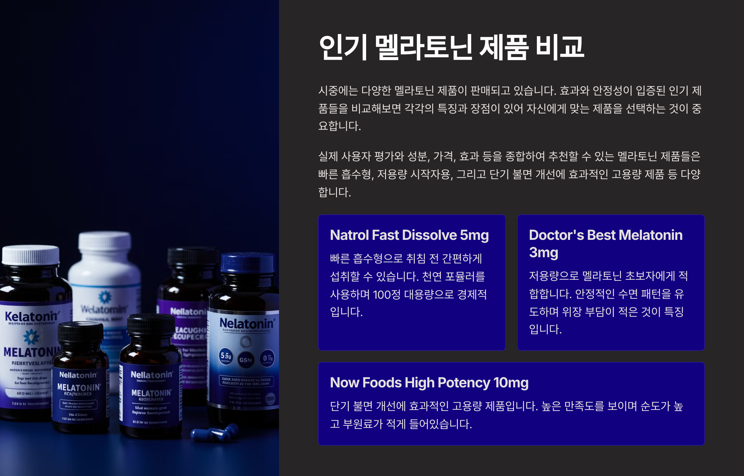 실제 사용자 평가와 성분, 가격, 효과 등을 종합하여 추천할 수 있는 멜라토닌 제품 3가지를 리스트로 정리해봤어요.