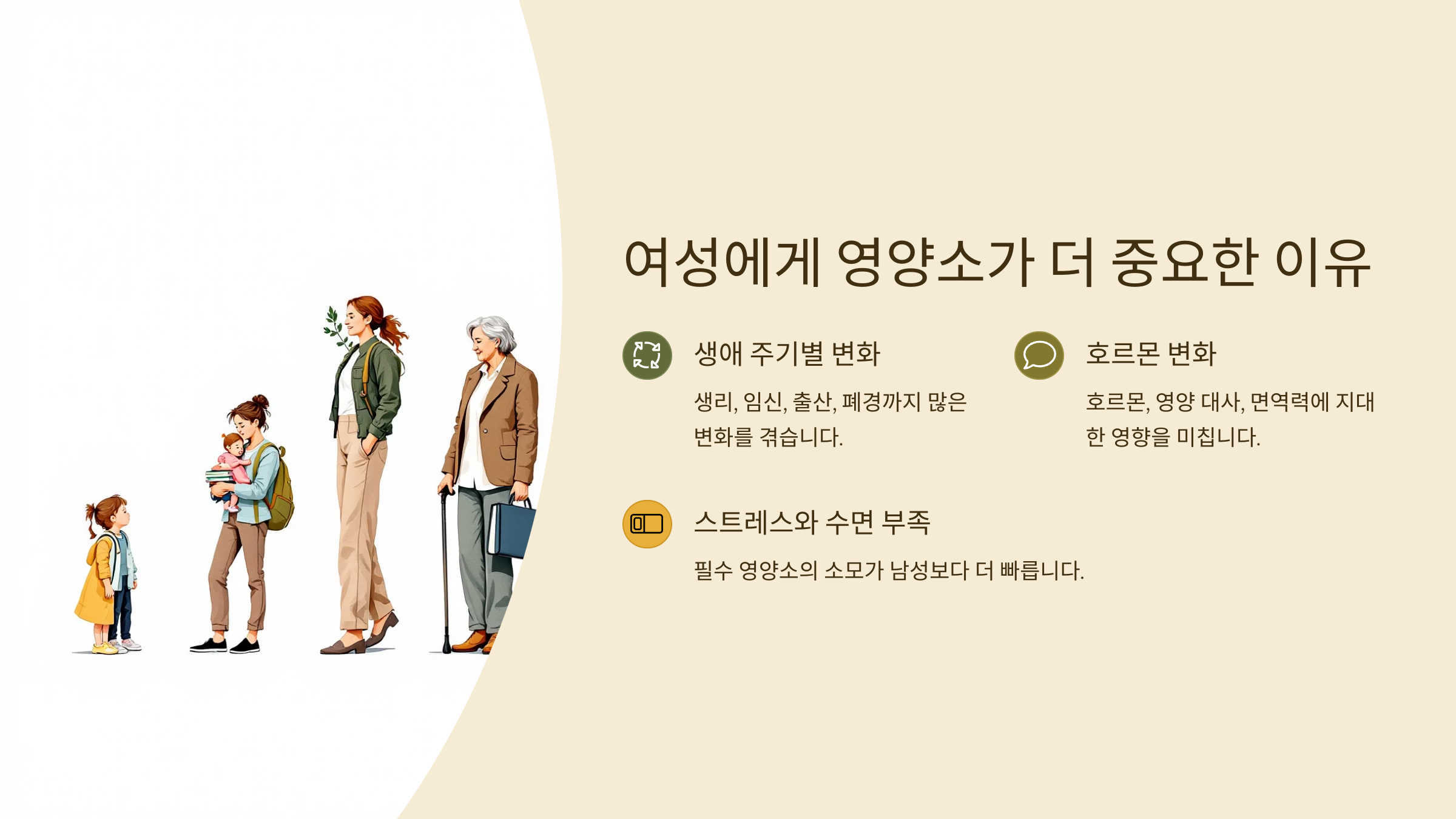 여성의 몸은 생애 주기에 따라 굉장히 많은 변화를 겪습니다. 생리, 임신, 출산, 폐경까지... 이 변화들은 단순한 신체 변화가 아니라 호르몬, 영양 대사, 면역력에 지대한 영향을 미쳐요. 특히 스트레스를 많이 받거나 수면이 부족할 때, 몸속 필수 영양소의 소모는 남성보다 더 빠르다는 연구 결과도 있답니다. 그래서 여성은 '보충'이 단순히 선택이 아니라 생존 전략이 될 수도 있어요.