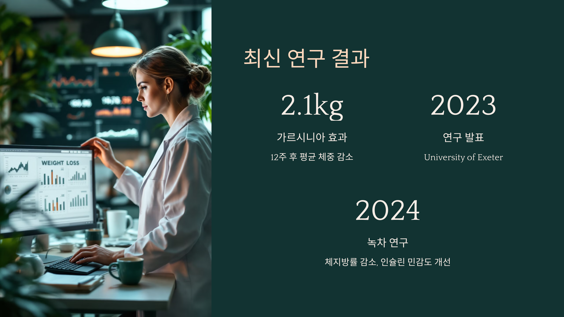 • 가르시니아 복용 그룹, 12주 후 평균 2.1kg 체중 감소 (University of Exeter, 2023)