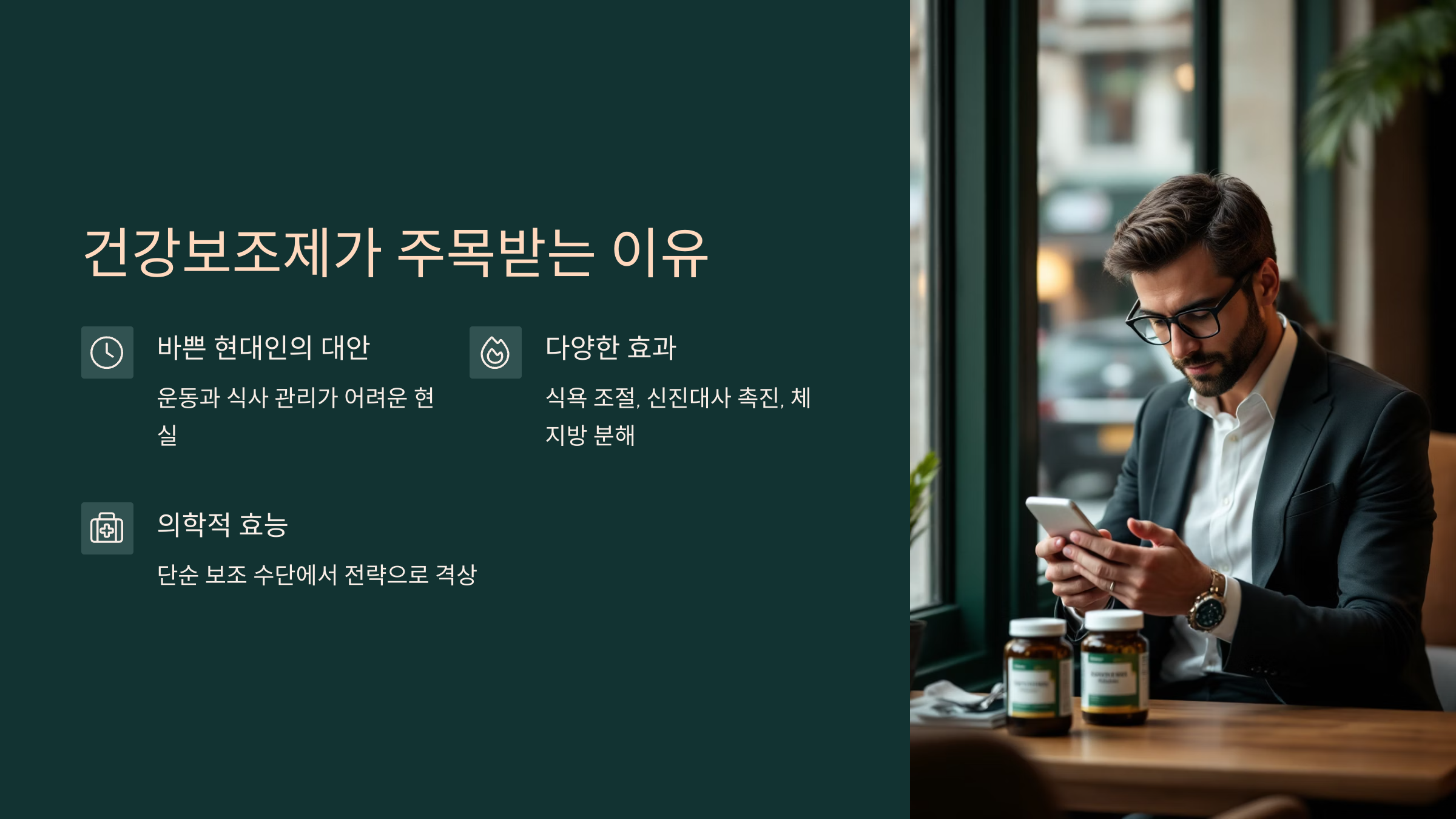 사실 다이어트는 단순히 ‘적게 먹고 많이 움직이면 된다’고들 하지만, 현실은 그리 간단하지 않잖아요. 바쁜 일상 속에서 운동은커녕 제때 식사도 힘든 분들 많죠. 그래서 건강보조제가 보조적인 수단으로 각광받고 있어요. 특히 식욕 조절, 신진대사 촉진, 체지방 분해 등의 효과를 내는 보충제들이 인기예요. 의학적 효능까지 논의되면서, 이제는 단순한 ‘보조’ 수준이 아니라 진짜 전략으로 떠오른 거죠.