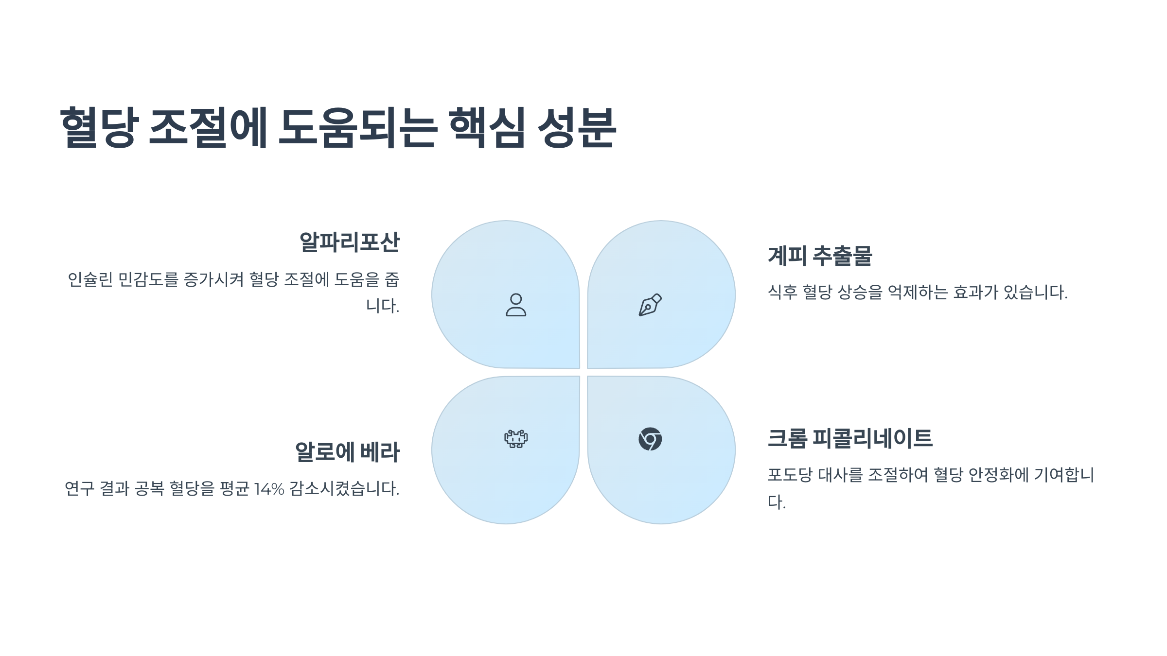최근 각광받는 성분들을 보면 단순히 혈당을 낮추는 게 아니라, 인슐린 감수성 개선이나 당 흡수 지연 같은 다양한 메커니즘으로 작용하는 것들이 많아요. 다음은 실제 효과가 입증된 성분들이에요.