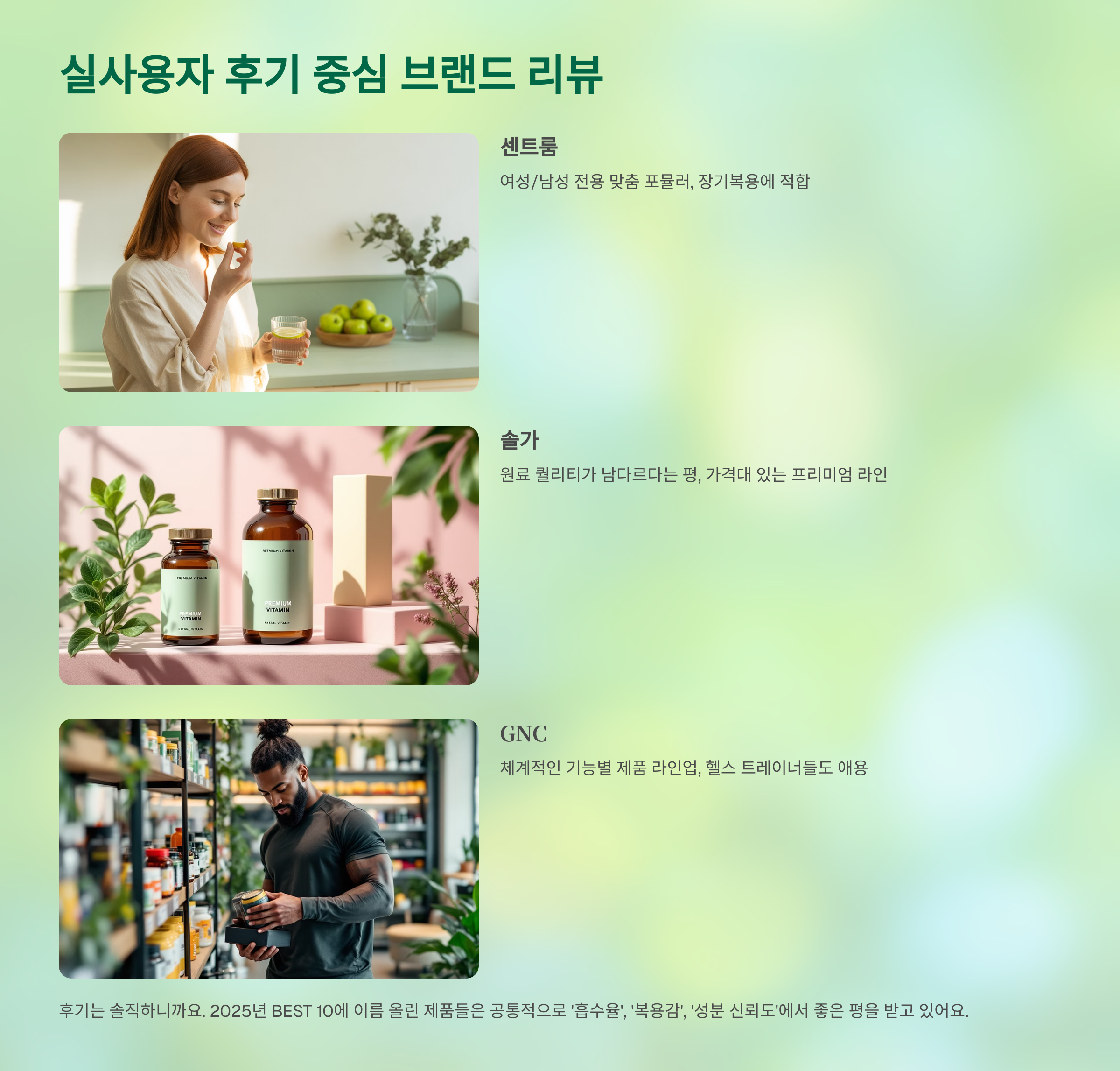 후기는 솔직하니까요. 2025년 BEST 10에 이름 올린 제품들은 공통적으로 ‘흡수율’, ‘복용감’, ‘성분 신뢰도’에서 좋은 평을 받고 있어요. 실제 사용자 후기 중심으로 브랜드별 특징을 요약해봤어요.